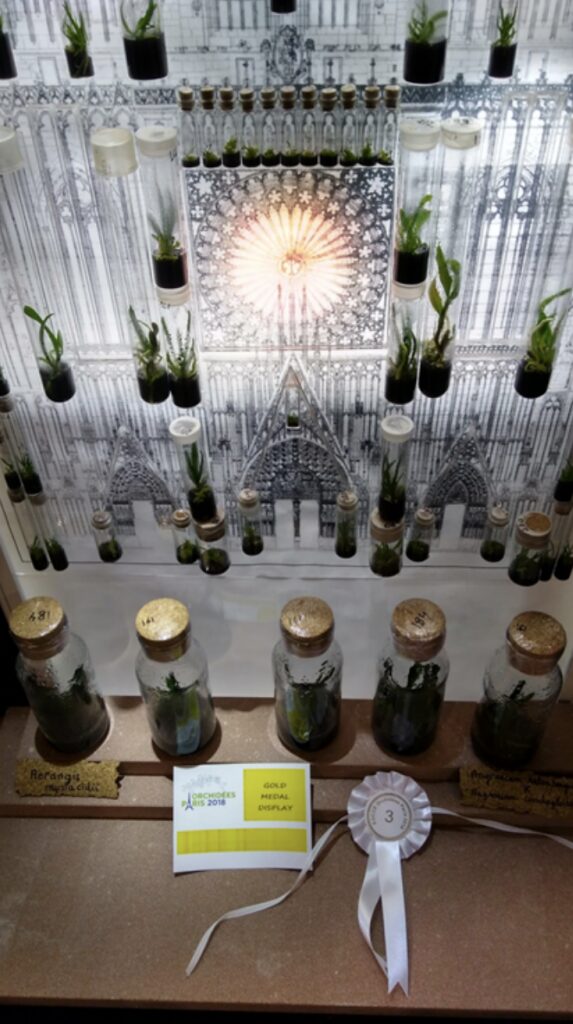 Médaille d’or pour l’originalité du stand et troisième prix pour les espèces orchidées en flacons toutes nommées.