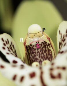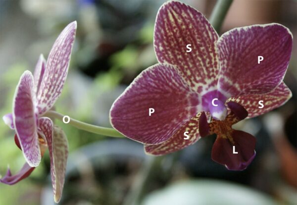 • ses six pièces colorées de l’enveloppe florale (périanthe), avec trois sépales (S) et trois pétales (P) dont l’un constitue le labelle (L),