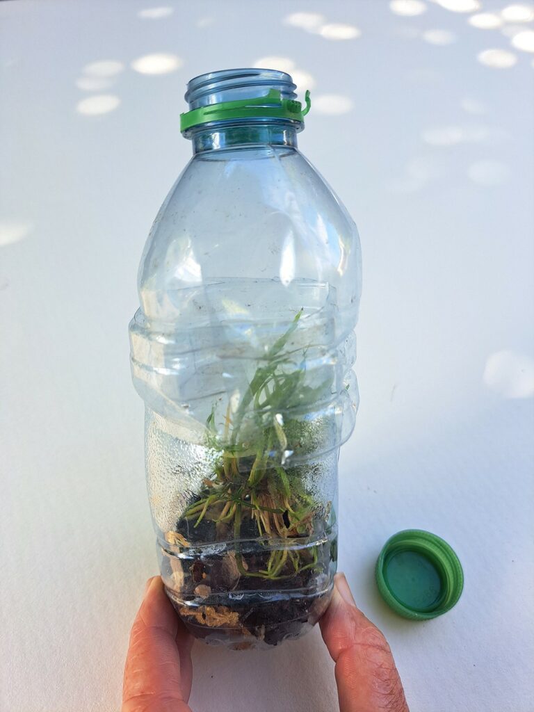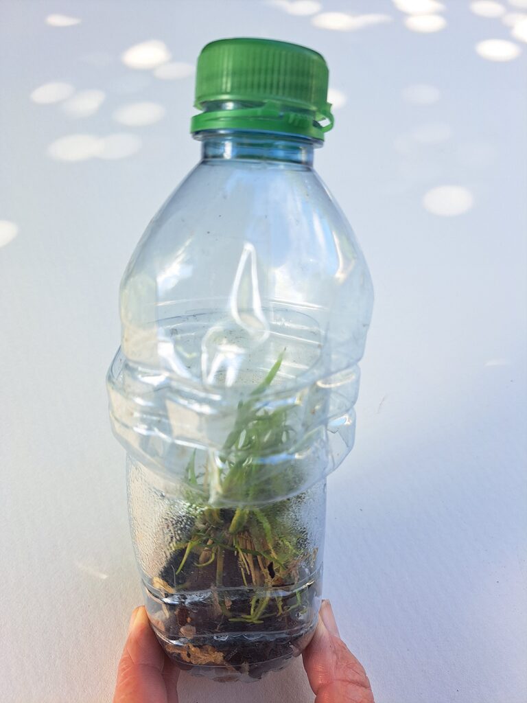 - Réaliser une mini-serre avec une bouteille en plastique en la coupant en deux pour introduire la touffe d’orchidées dans un substrat d’écorce fine et de sphaigne