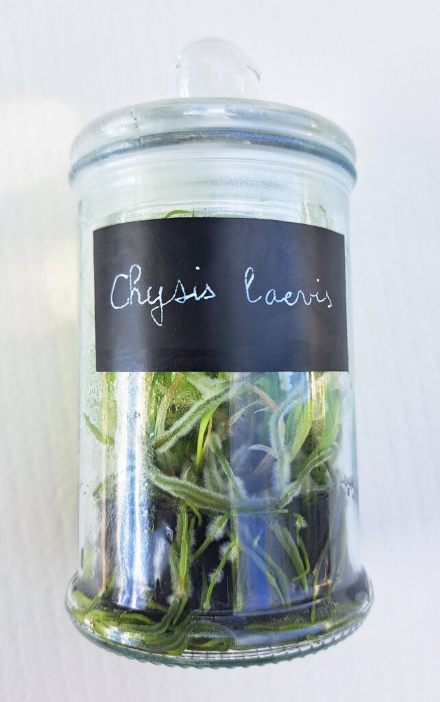 Un protocole strict est à suivre pour acclimater les orchidées, qui passeront d’un environnement à 100% d’hygrométrie du flacon à un taux plus faible dans une pièce. C’est une phase délicate. Travaux pratiques avec un flacon stérile de Chysis laevis.