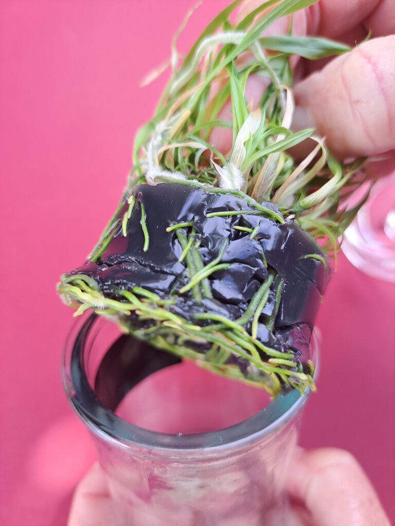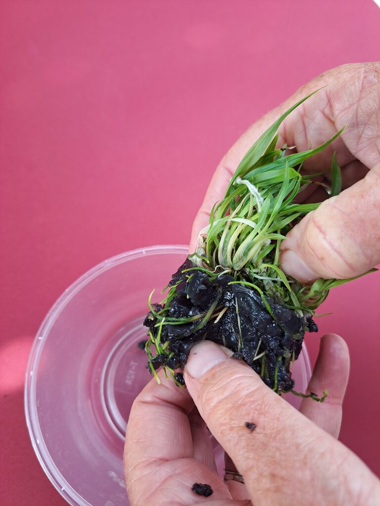 • Ouvrir le flacon et sortir la touffe d’orchidées avec le milieu de culture gélosé (solidifié par la gélose noire).